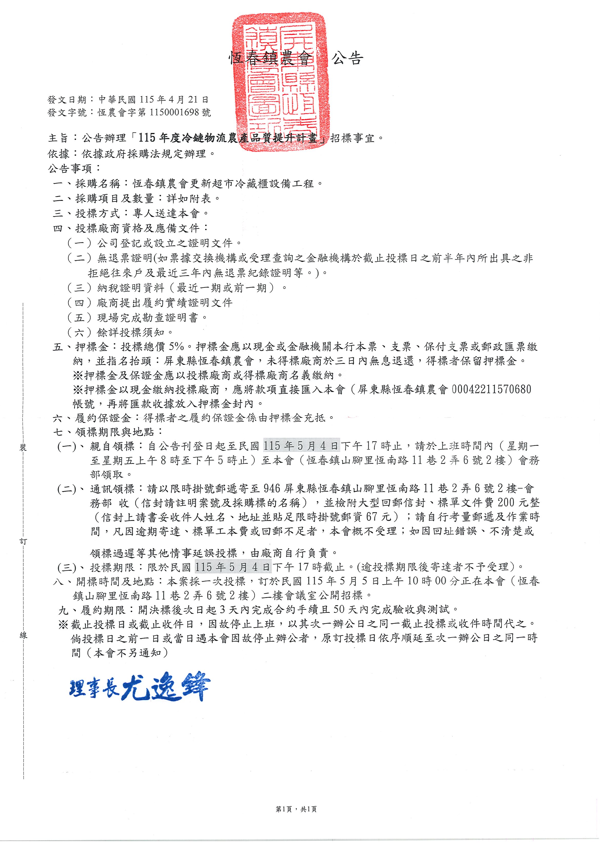 有關辦理:115年度冷鏈物流農產品質提升計畫事宜,詳附件