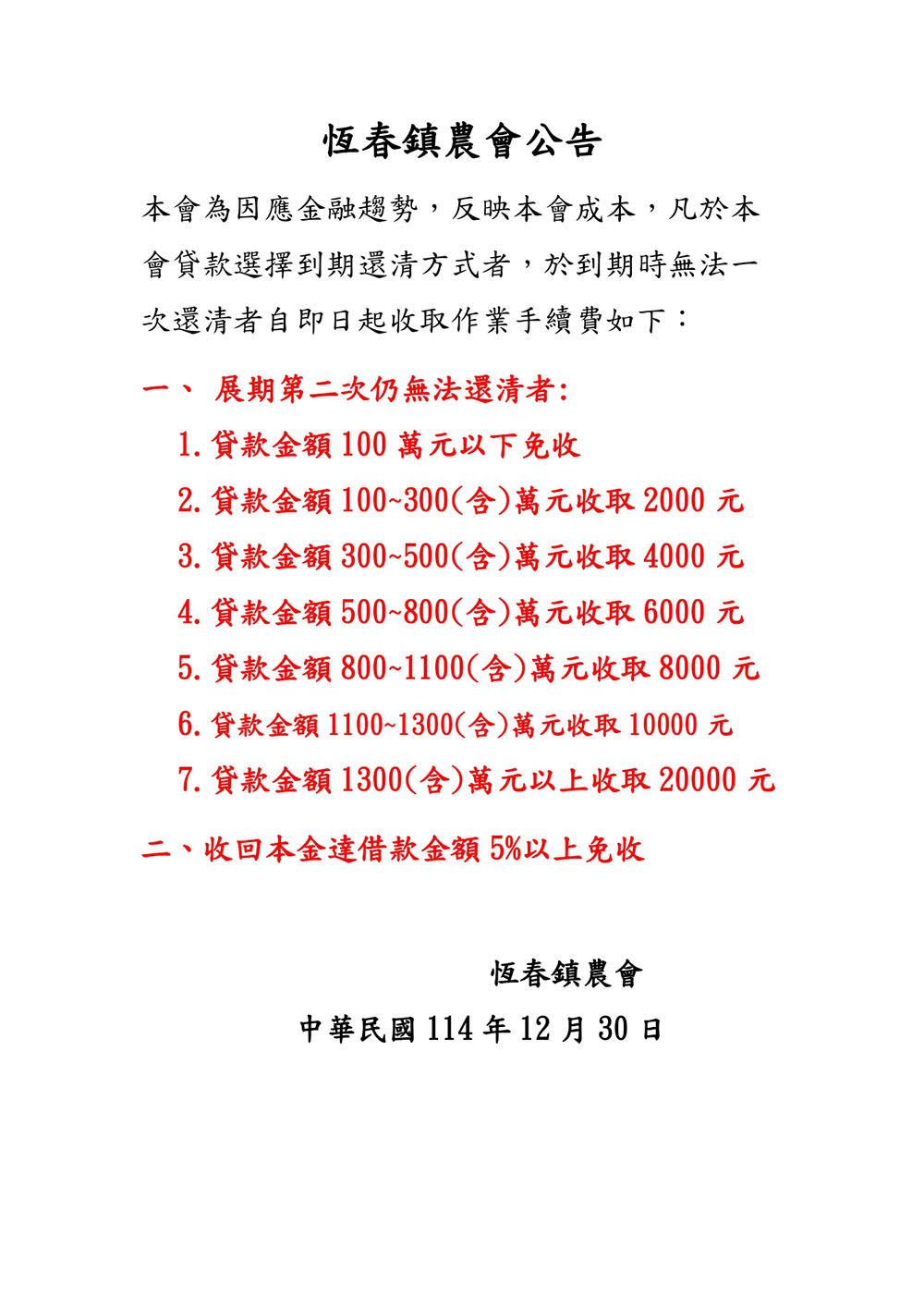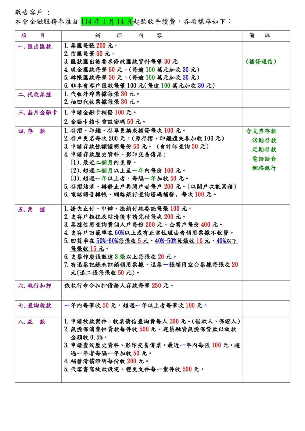 ※本會信用部公告金融機構收費標準如附件